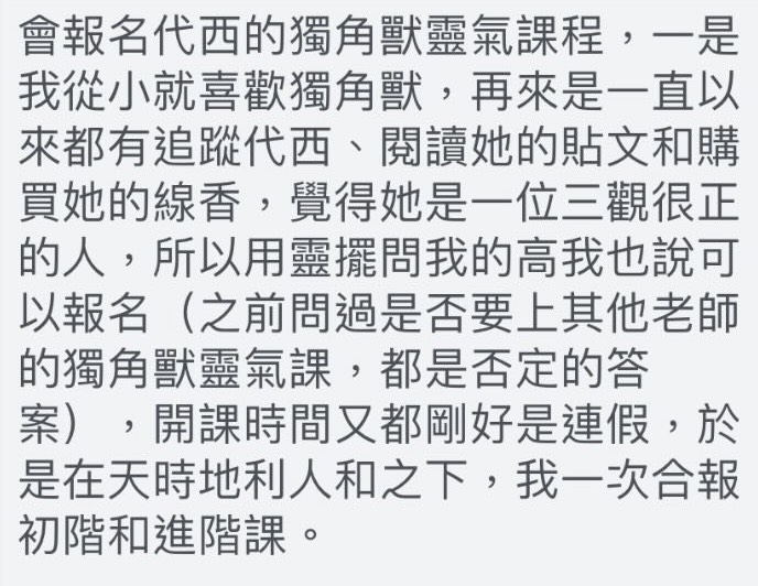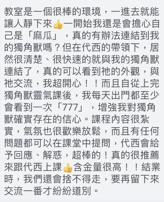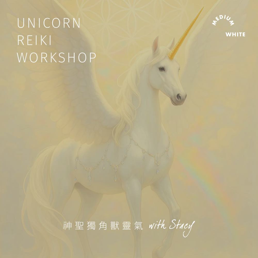 首頁 神聖獨角獸靈氣 近期開課日期! 進階 台北假日 4/17-4/19(確定開班) 初階 台北假日 7/10-7/12(確定開班) 進階 台北假日 8/14-8/16(確定開班) 獨角獸是開悟智慧,不受框架束縛 獨角獸帶你自由飛翔、解放心靈、充滿喜悅,圓滿實現你原本認為遙不可及的夢想。 獨角獸開悟光角就是高度發展的眉心輪,如同萬能魔法棒般,能療癒人類身體、思想情緒,並且圓滿人類的靈魂願望。獨角獸是智慧進化到第七至九次元、已開悟揚升的馬。祂們是純淨的神聖白光,具備無條件的愛、和諧、坦誠、熱情服務的特質。獨角獸能量能淨化我們的身心靈,幫助我們啟動神性與純真,清除業力執著,回到自由喜悅的狀態。 獨角獸靈氣是什麼? 獨角獸靈氣將連結獨角獸王國,透由點化 (無任何符號) 啟動我們的第三眼,發展我們自己的開悟光角。這將使我們逐漸與獨角獸頻率對齊,最終成為人間獨角獸。這不是只有單純召喚祂們而已。 獨角獸靈氣對人類的幫助 ☞ 揭開第三眼幻象帷幕,協助人類進入開悟道途☞ 淨化身體的脈輪,為身體解毒☞ 解除第三眼限制封印,開展靈魂的天賦才華☞ 強化直覺力、與心想事成的顯化能力☞ 實踐靈魂願景,讓靈魂揚昇品質落實於行動☞ 協助人類與動物、植物、礦物的連結與溝通 加入工作坊 詳細報名資訊 獨角獸靈氣學什麼? 初階:啟動光能,連結與你有緣的獨角獸☞ 接受獨角獸國王與皇后靈氣初階點化☞ 製作獨角獸實現願望光球☞ 運作靈氣療癒自己與別人☞ 更多…(詳情請參考報名表單)進階:深化獨角獸療癒,連結你的飛馬☞ 獨角獸靈氣修補強化乙太光網☞ 與水晶礦石、植物、動物、元素精靈的溝通☞ 飛馬療癒開啟心輪、修補關係連結☞ 更多…(詳情請參考報名表單) 詳細報名資訊 學員回饋 由內而外的改變,靈魂都知道 工作坊帶領人 Stacy Stacy擁有豐富療癒經驗,指導靈的引導風格務實接地、又充滿幽默感令人放鬆。也與揚升大師、天使、獨角獸有著深厚的連結,我們善於打破虛幻&框架,帶領大家從核心本質理解靈魂世界。 ➤➤ Certification⟡ 英國天使靈氣 大師級教師⟡ 神聖獨角獸靈氣 教師⟡ ThetaHealing認證療癒師⟡ 美國NGH催眠治療師⟡ 金錢靈氣導師⟡ 來自指導靈最直接的傳承教導⟡ Medium White & 暮靄 主理人